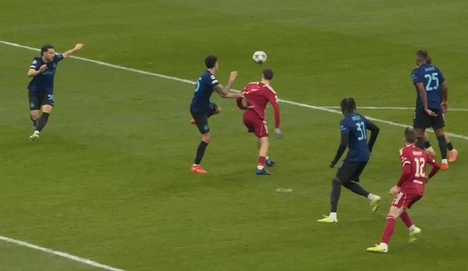 比塞克上场后带动了国米进攻速度的提升,特别是他一次前插到禁区前沿的远射打门,打在了禁区内范戴克的手上,但裁判以手臂紧贴身体为由拒绝判罚点球。半场结束前,巴雷拉的任意球和泽林斯基的远射先后两次制造威胁,而劳塔罗接巴斯托尼传中的一次头球攻门则是国米全场最接近得分的一次射门,可惜因为角度太正被阿利松扑出门外。